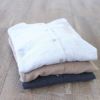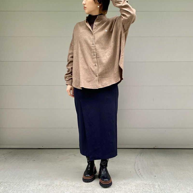 ドロップショルダーで柔らかな印象のシャツをバンドカラーにすることで甘さを控えめに。起毛をかけてさらにふっくらとした仕上がりの素材は日本製ならでは。